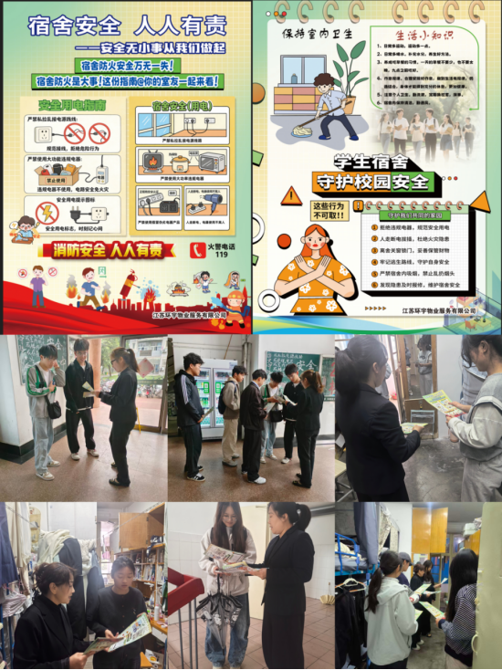 为了加强学生宿舍的安全管理,普及宿舍安全知识,提高全体学生的安全意识,创造安全、和谐、稳定的宿舍环境,4月22日,江苏环宇物业服务有限公司在文昌校区宿舍区组织开展了宿舍安全宣传教育活动。